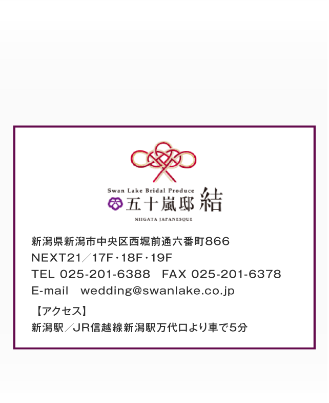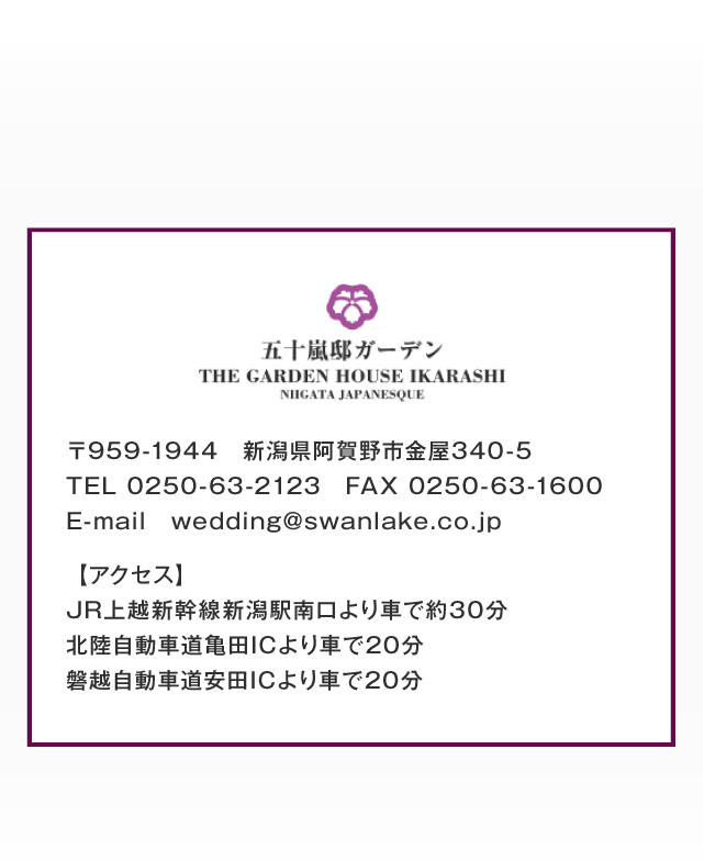 キリスト教式も神前式も、おふたりが自由にオリジナルを創り上げる人前式も。 五十嵐邸ガーデン レストランスワンレイクでは全ての挙式スタイルが可能です。 神前式で日本らしい「和」を大切にすることも、白いドレスを着て教会式も、自由に創り上げる人前式も、全てはおふたり次第です。 想い描く理想の結婚式を叶えて下さい。